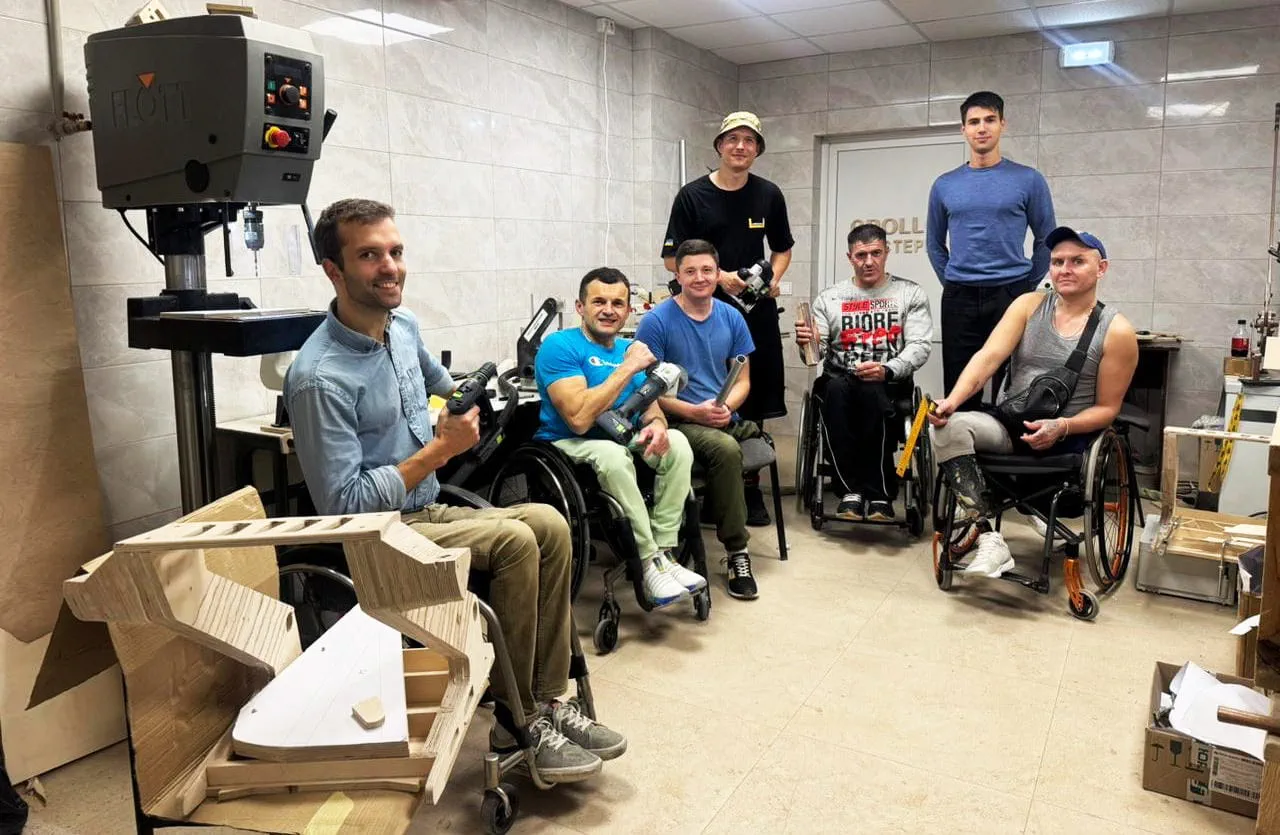 At the Unbroken Center, the rehabilitation centre provided a small room in the basement of a building - around 25 square metres in size, but enough to set up a functioning workshop. Paul brings the necessary equipment from France and sets up the room so that the participants can work there safely and comfortably. The first small programme soon begins: six participants meet regularly to work together on their own wheelchairs. Over a period of almost five weeks, the group comes to the workshop five days a week for around three hours at a time.