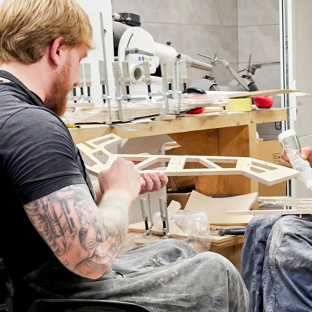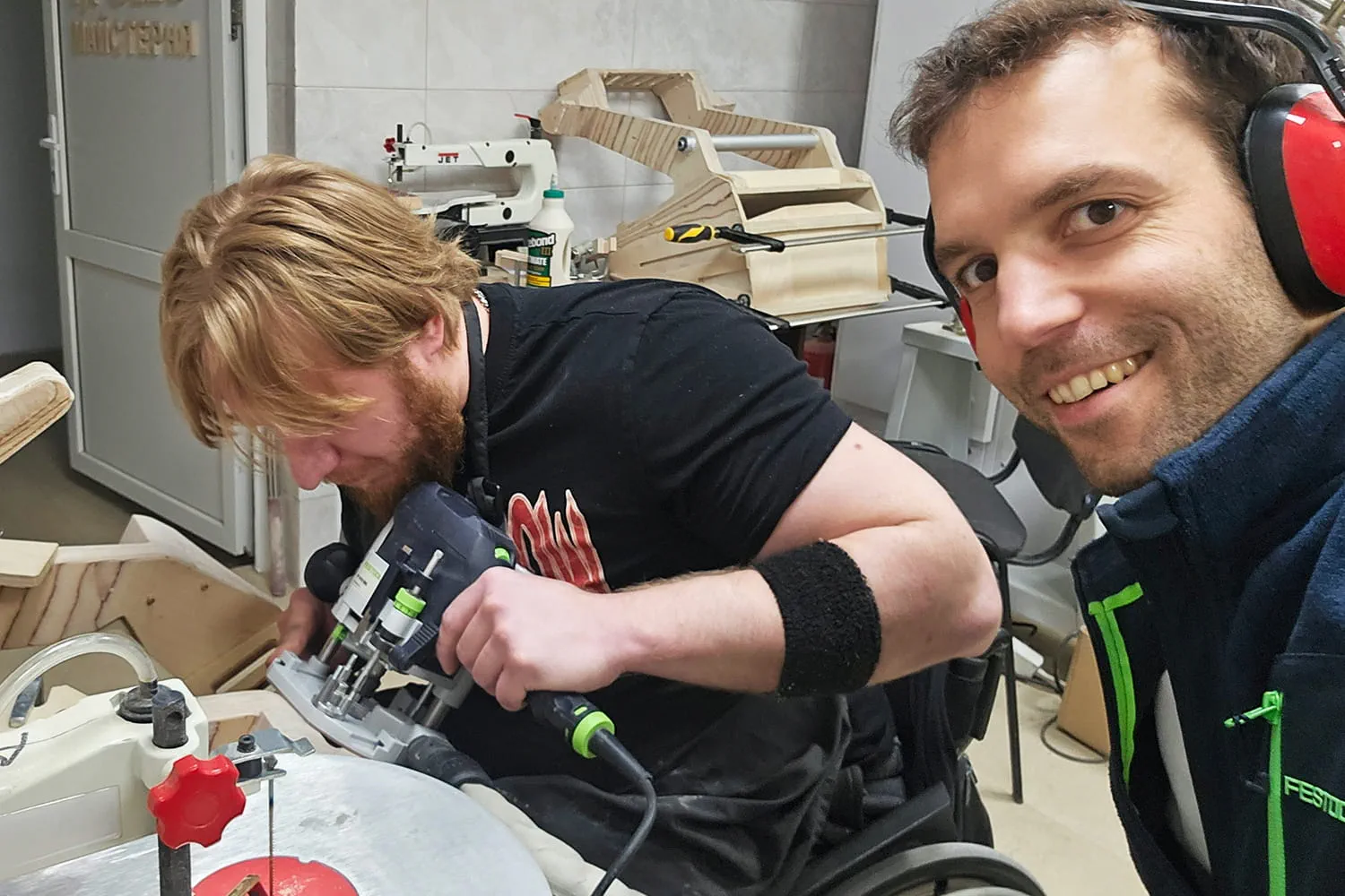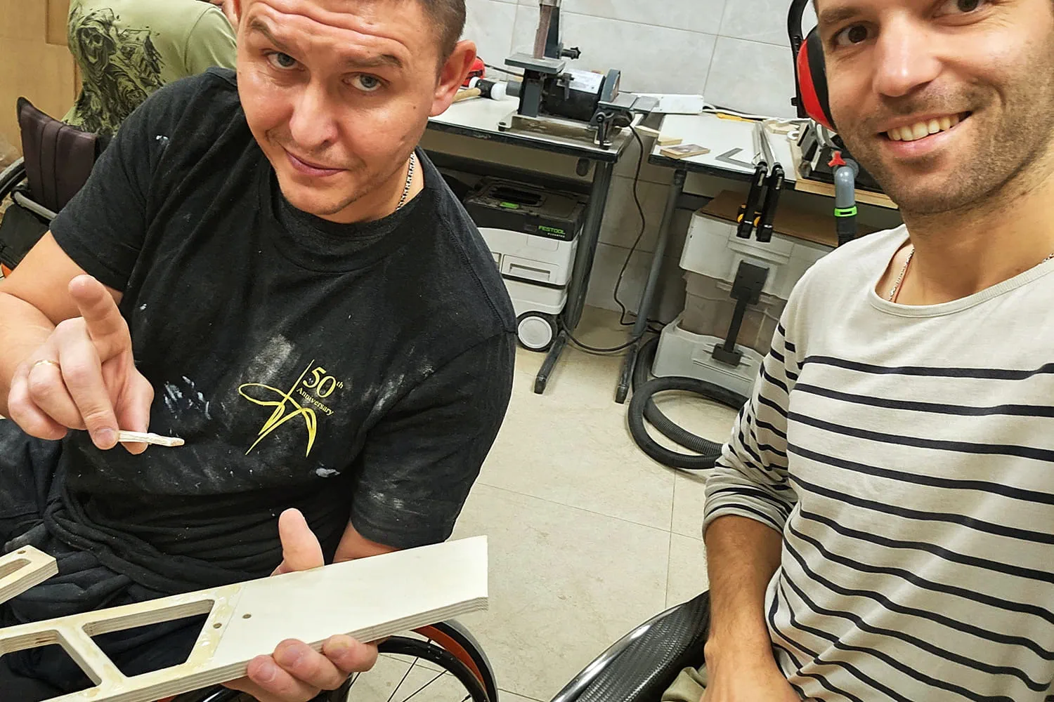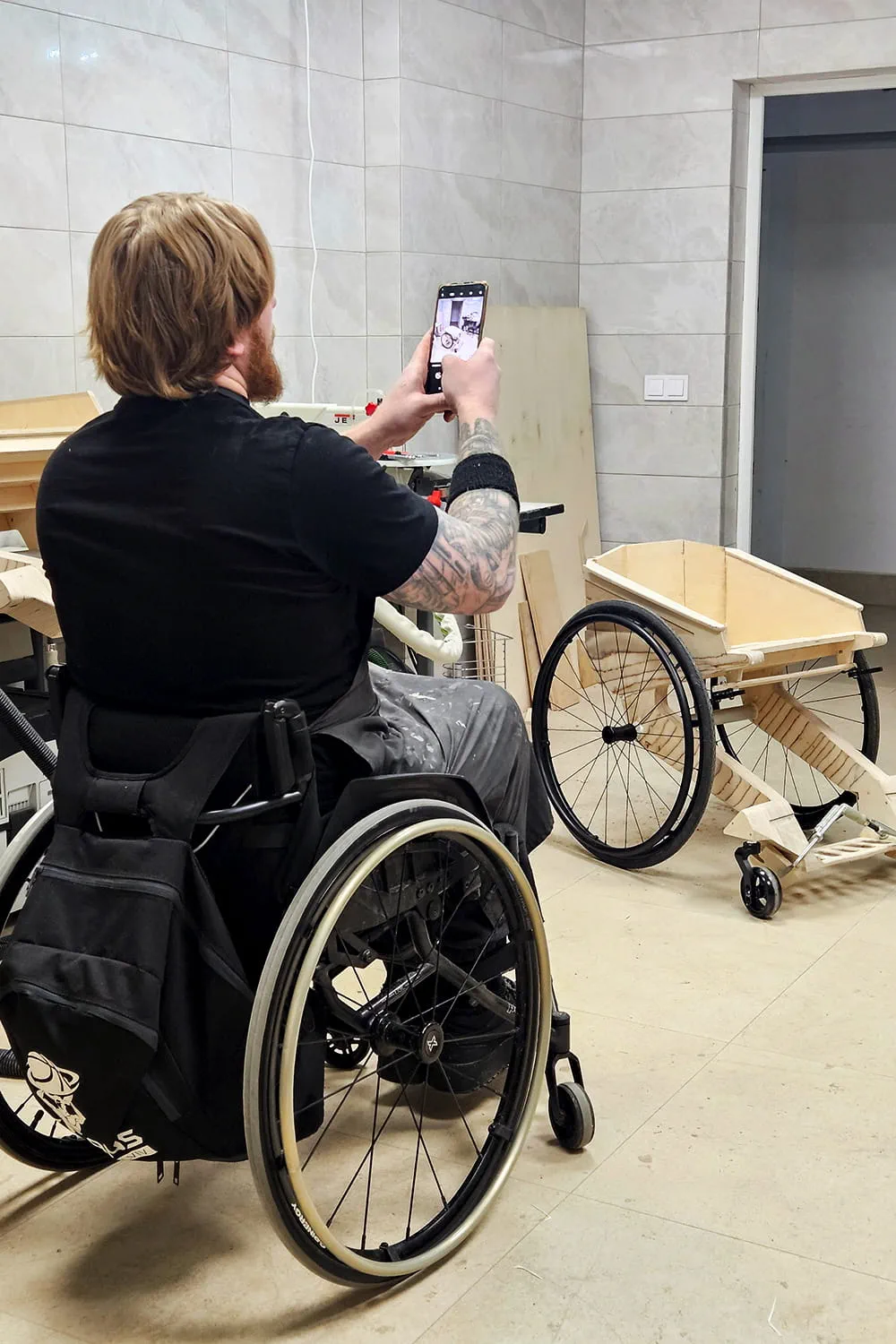 Step by step, customised wheelchairs are created from wooden panels and individual components. But the aim of the project is more than just a finished aid. The work in the workshop is also intended to give the participants structure in their everyday lives, new motivation and a clear goal.