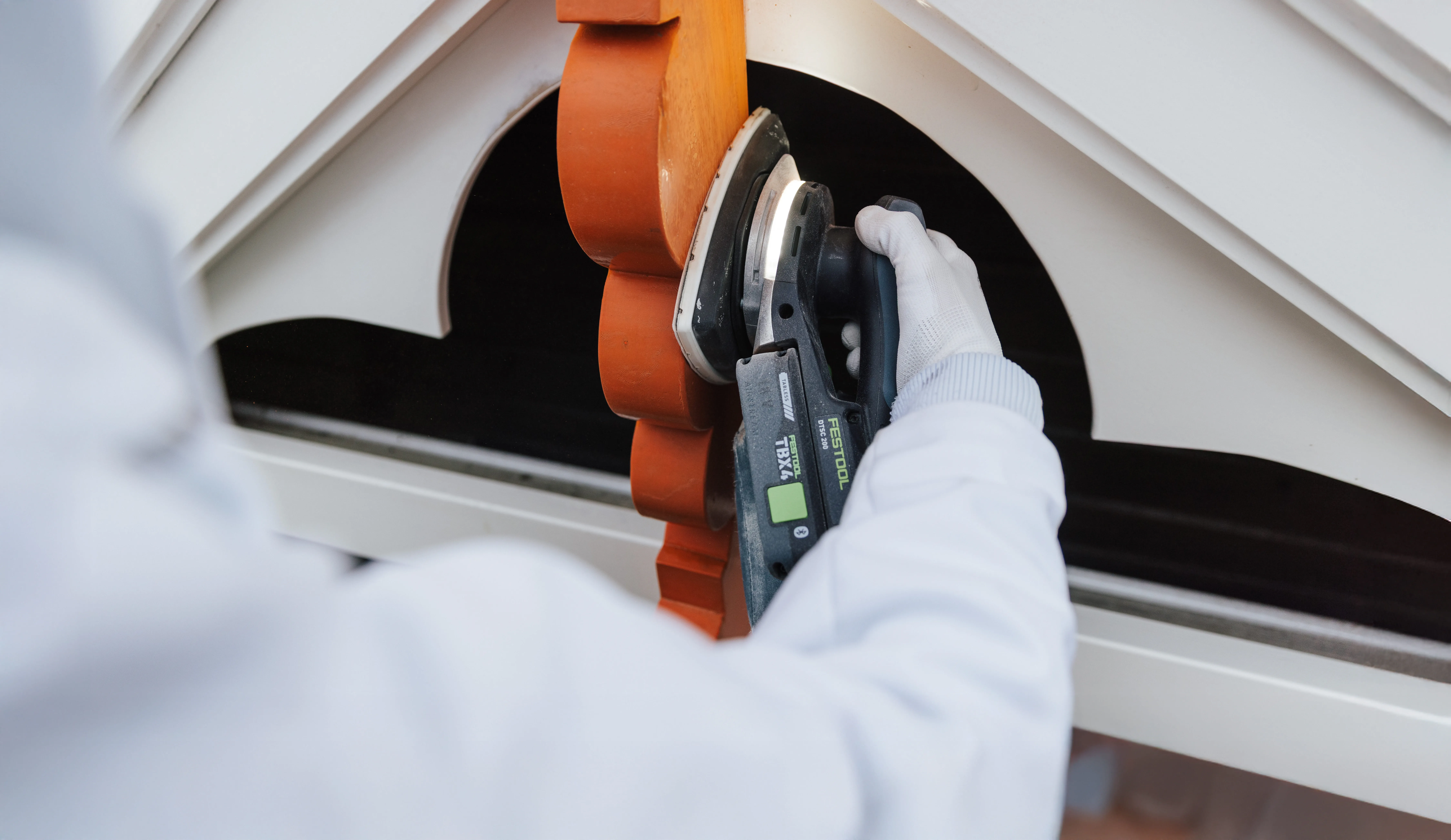 Luke de Jager's favourite place to work is high up on the Steiger. He is carefully sanding down the characteristic roof ornament, which sits enthroned on the roof ridge in a muted shade of orange. The wooden surface is weathered and the coating is already peeling off. With the DTSC 200 Delta sander, Luke can also achieve curved, profiled and tapered surfaces. When things get particularly angled, he uses the DTSC 400.