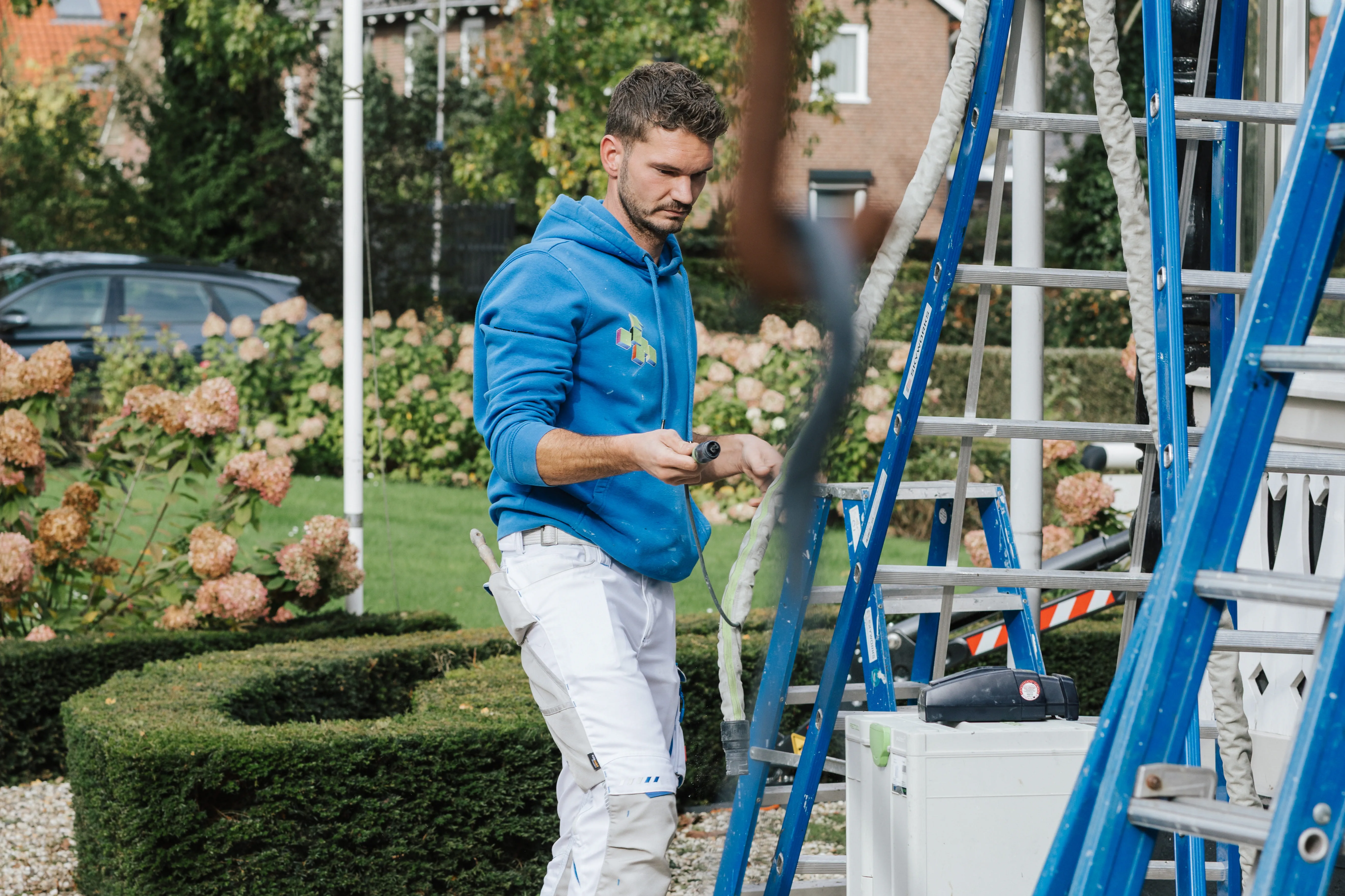 The young painter attaches great importance to working outdoors on the riser with a dust extractor or Chip collection bag. Because he can work more cleanly and protect himself. "Many of my colleagues underestimate this when they work outside," he calls down from above. "But here in Holland you always have gusts of wind that, in the worst case, blow dust into your face when you're sanding."