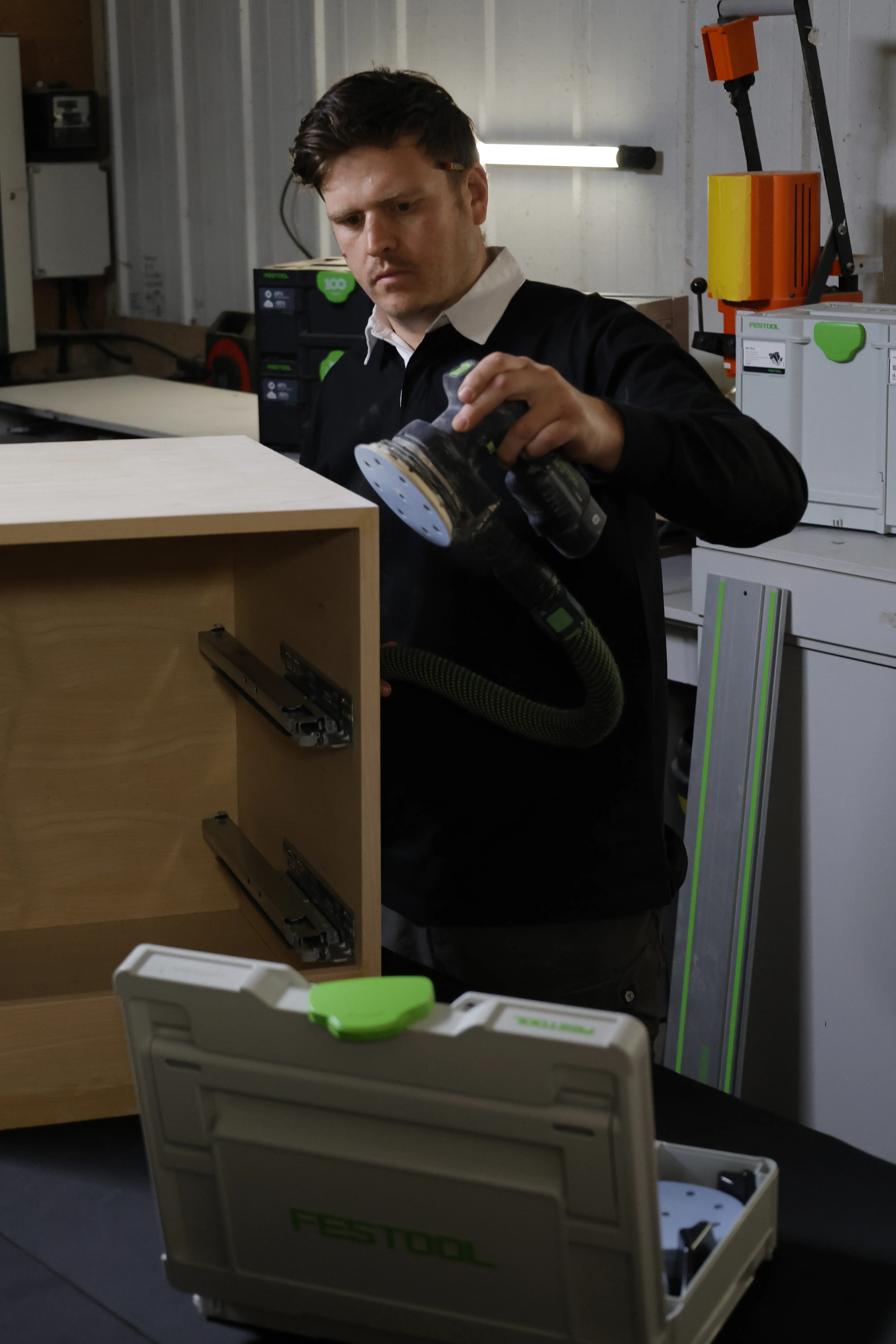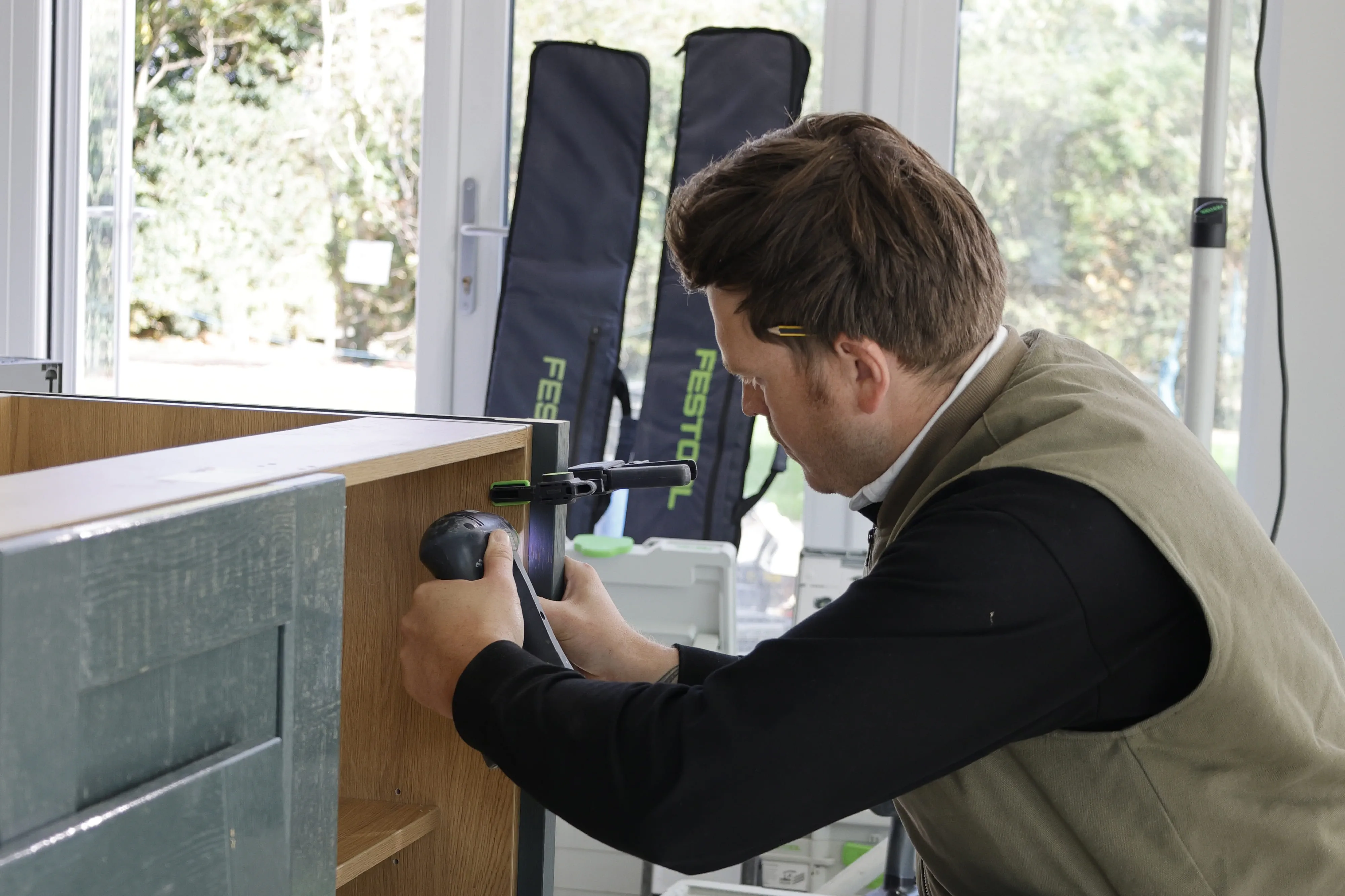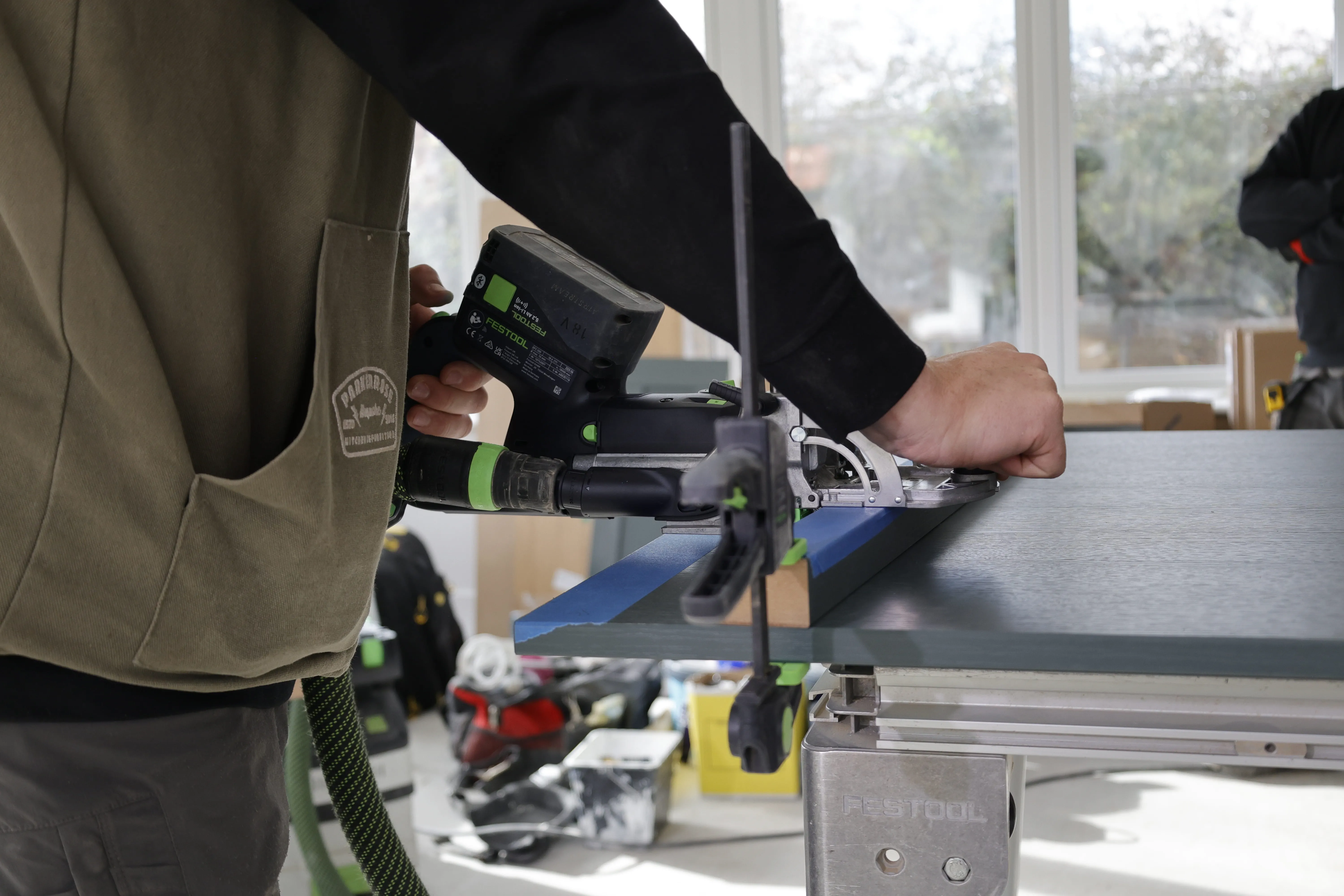 Rory’s journey with Festool started a long time ago, rooted in his early days learning trade skills with his dad and progressing into high-end kitchen installations. He was later selected as a winner in Festool’s “With You Everyday” campaign, awarding him £10,000-worth of tools and giving him even more opportunity to test and refine his kit on his jobs.