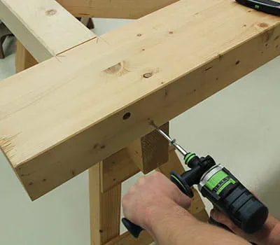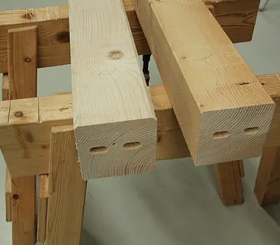 When joining construction timbers, these days traditional wooden joints, such as mortise and tenon, are often replaced with various metal joints (screws, brackets, bolts, etc.). The advantage of traditional wooden joints is that they are easy to assemble, as the purlins and posts can be slotted together. In this example, domino dowels are used instead of a mortise joint in order to produce a push-in connection. This speeds up assembly and delivers the cleanest results. The Domino XL joining machine is used for this primarily.