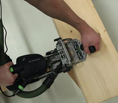 Now position the DOMINO XL on the post marking and complete the first milling groove. Then complete the second milling groove, thereby ensuring that the stop pin (centre pin) is positioned in the first milling groove again.