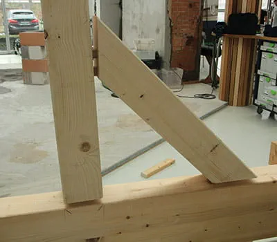 The use of Domino dowels to position the construction timbers precisely enables quick and easy connection of the purlin to the post.