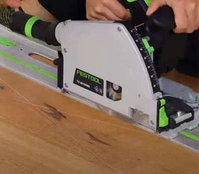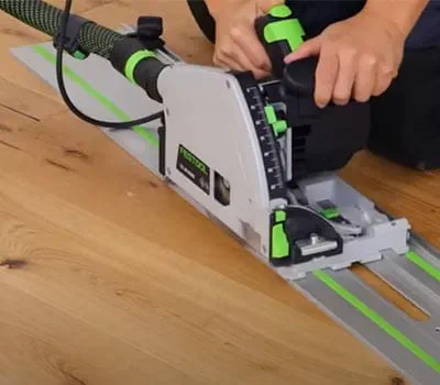 In the next step, set the circular saw to the cutting depth. To avoid scratching the screed with the saw blade teeth, adjust the height of the flooring, or floorboard in this case (this application example it's 15 mm). Perform the entire process with the setting, incl. the guide rail marking (guide rail thickness included). Don't forget to connect your dust extractor!
