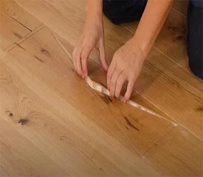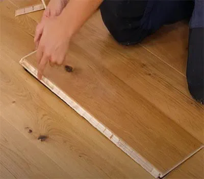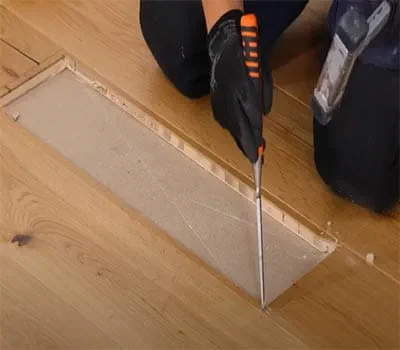 Now adjust the new wooden floorboard. Check whether the floorboard fits. Here the tongue and groove need to be adjusted so that the floorboard can be inserted.