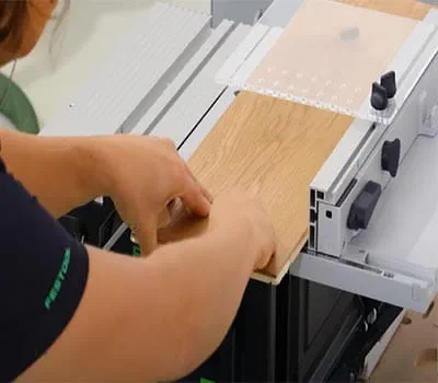 We start with the long side and adjust the parallel side fence in such a way that the lower part of the groove is removed precisely so that the floorboard can simply be placed on the tongue. To do this, fit the guide wedge to the saw for grooving and, for safety reasons, fit a cover over the saw blade. (see image)