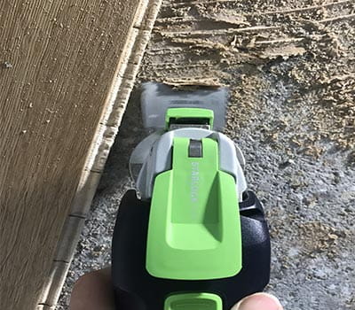 First, we saw diagonally to make a cross in the floorboard for it to be removed.