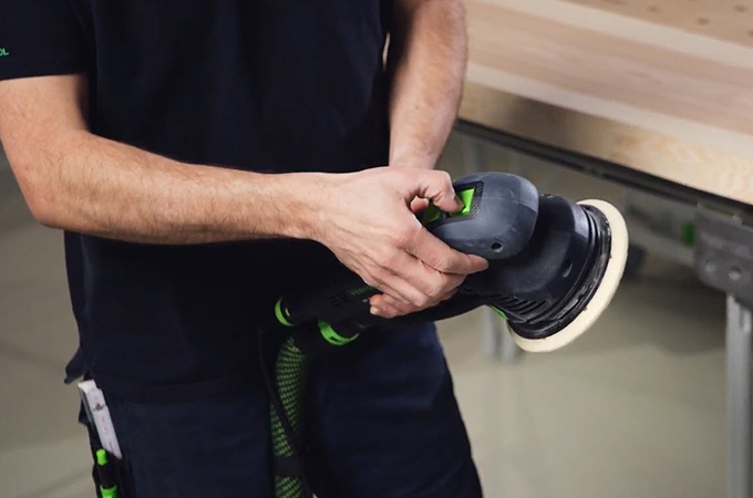 During fine sanding, the resulting sanding marks must be sanded up so that they are no longer visible after the surface treatment. To do this, the P120 grit is initially left on the machine. The ROTEX is switched to the eccentric movement (fine sanding). The sanding marks from the coarse sanding are then removed. Here, too, work is carried out in a cross motion.