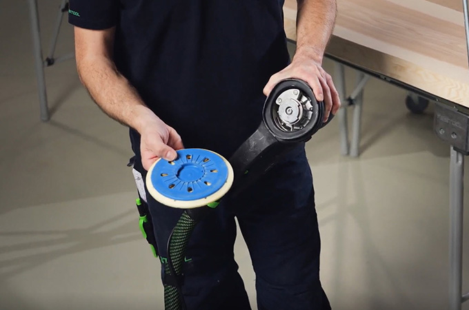 The disc on the ROTEX can be changed very quickly using the FastFix interface. To do this, first disconnect the mains plug and then set the changeover switch to coarse sanding. The spindle stop is then actuated. The disc is then turned anti-clockwise without tools.