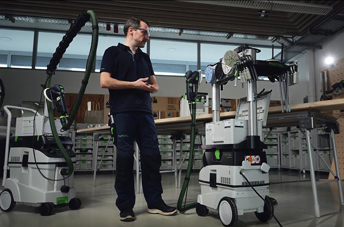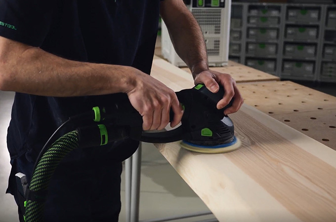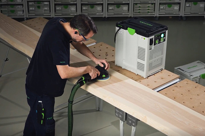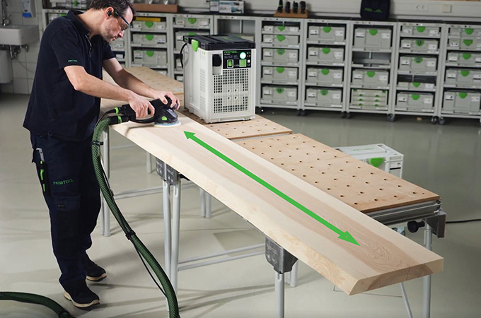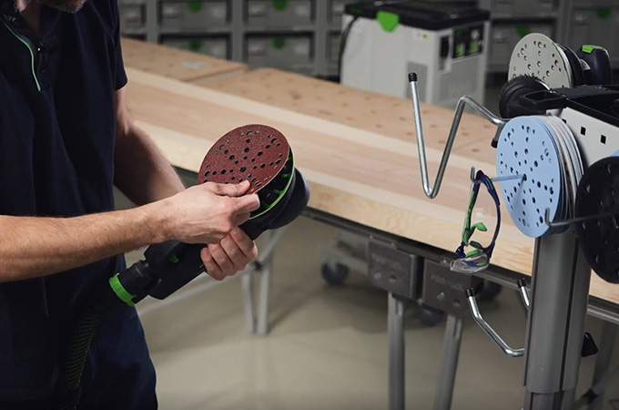 Planed wood surfaces have so-called knife marks, also known as plane marks, caused by the Planer blades. These must be sanded before surface coating. This results in a smoother, more homogeneous surface and the surface coating has a better grip or can penetrate the wood better. If you don't have a large stationary sanding machine, this step can be carried out using a hand-held sanding machine. The ROTEX is ideal for this because it combines coarse sanding and random orbital sanding in one machine. As this work is mainly carried out in the workshop, it is advantageous to set up the workplace accordingly. That is why we would like to take a brief look at our system accessories here.