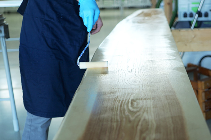 For woods such as oak, it makes sense to water the surface before the final sanding. To do this, moisten the surface with a damp sponge or cloth. The wood fibres stand up and can then be levelled with a final fine sanding after drying. During intermediate sanding after the first surface coating, these fibres are already cut and the surface becomes even smoother. Soaking is also a great advantage when working with stains.