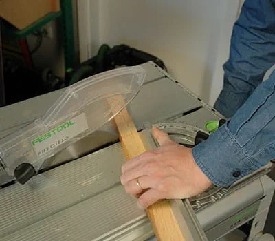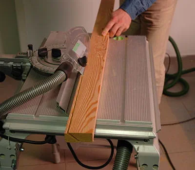 In order to obtain a precise cut edge, change the pendulum stroke setting on the jigsaw to 1. Use a table saw to cut the roof end strips at an angle lengthways. For long cuts in solid wood, it is strictly necessary to use a coarse saw blade. Use the table saw to cut the strips to the correct length.