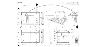 Now you can draw the roof curve and then the curve for the entrance door. Use a jigsaw (curved saw blade) to cut out both curves and transfer the upper curve to the rear gable wall, then use the jigsaw to cut this too. Equally, the curve could be taken straight from the 1:1 scale drawing provided.