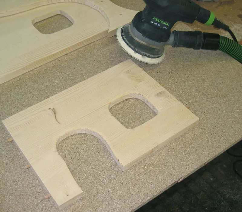Sand each of the edges and using a router or a hand saw, cut out the rounded door and window shape. Sand the surfaces by hand or using an eccentric sander.