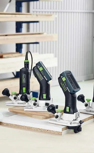Festool Edge routers offer you more flexibility and manoeuvrability for smooth work processes. For example, when rounding and chamfering solid wood or plastic edges, Edge trimming cutters for protruding laminate panels or edge banding. Thanks to their slim design and optimum centre of gravity, they can be guided safely without tipping over. Thanks to precise routing depth adjustment, reworking is significantly reduced. This means you are equipped for every application in the edgebanding area.